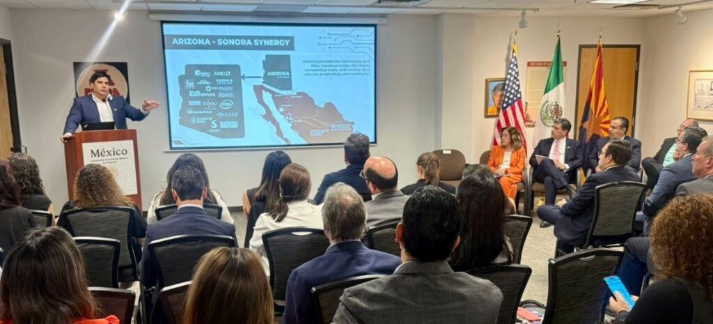 Phoenix, Arizona; 9 de octubre de 2025.- Bajo el liderazgo del gobernador Alfonso Durazo Montaño, el Gobierno de Sonora consolida al estado como un socio estratégico de Norteamérica en la industria tecnológica- incluidos los semiconductores- y de energías limpias, expresó el presidente ejecutivo del Consejo para el Desarrollo Sostenible de Sonora (Codeso), Francisco Acuña Méndez, al presentar el Plan Sonora de Energías Sostenibles durante el foro “México Market Briefing”, en el marco de SEMICON West, realizado en Phoenix, Arizona.